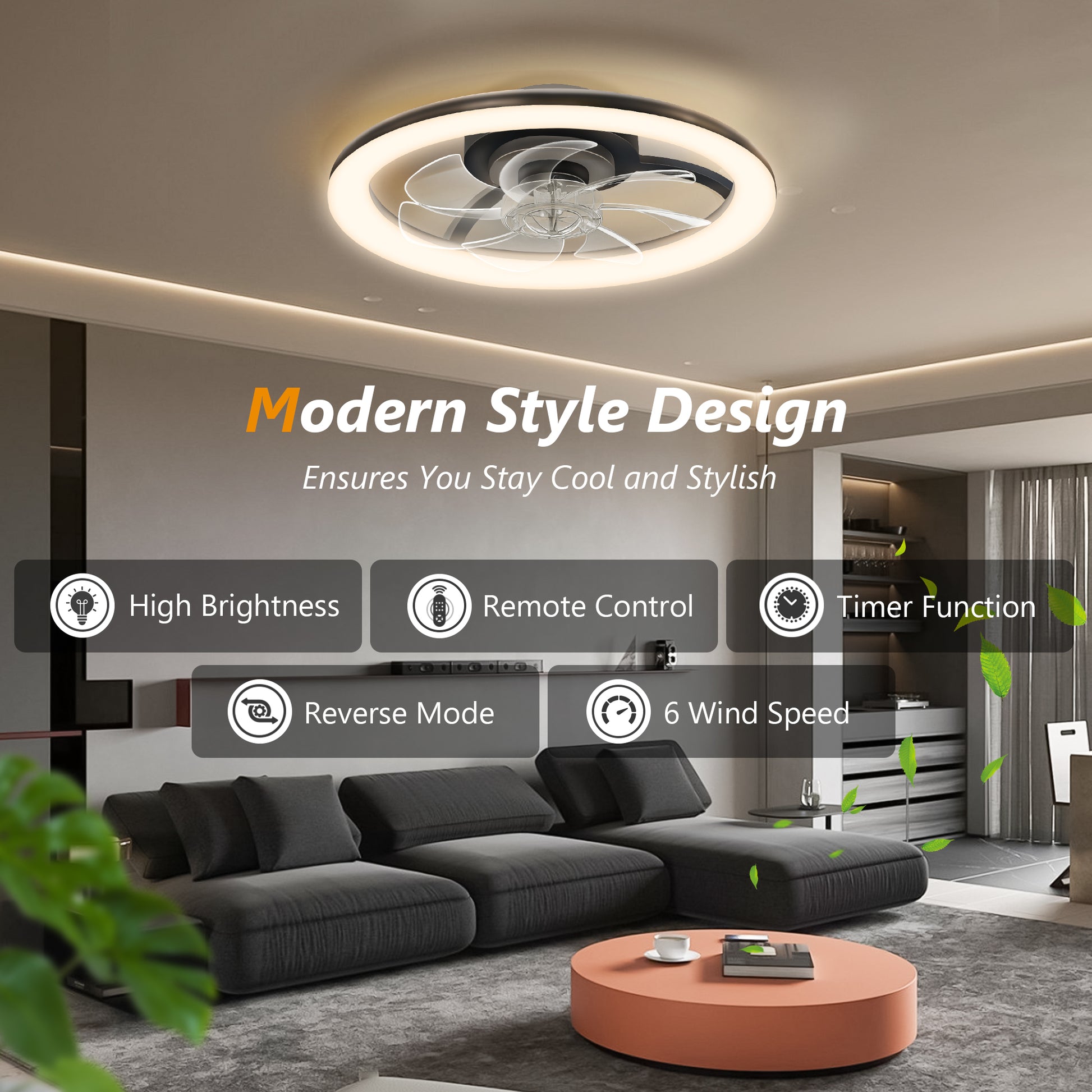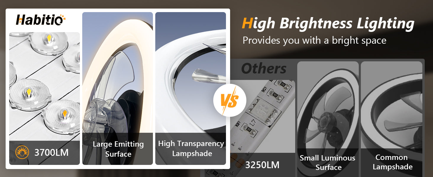 Habitio low profile ceiling fan with light features a minimalist modern design style, choosing a low-profile and calm black color to help you enhance your chic home style.The high brightness of 3700LM, coupled with a high translucent shade with a high transmittance rate, provides a larger light transmitting surface compared to other modeling shades, such as crystal facets, which offers a larger illumination angle and provides you with a brighter lighting environment.