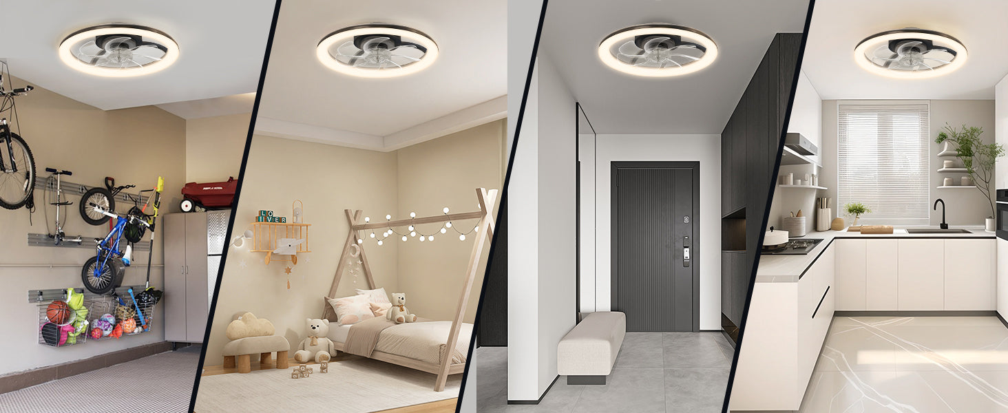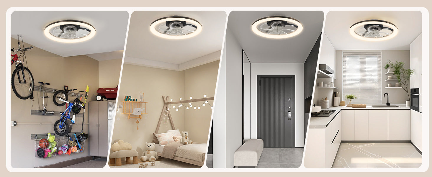 We have assembled the accessories for you in advance, so you can finish the installation in a few minutes by yourself. In addition, disassembly is also more convenient, compared with other brands need to remove the screws, we just need to rotate down. Our bladeless ceiling fan with light is suitable for 13-15ć” space, suitable for children's roomsļ¼kid's room), bedrooms, kitchens, checkroom, bathrooms and and other small indoor spaces.