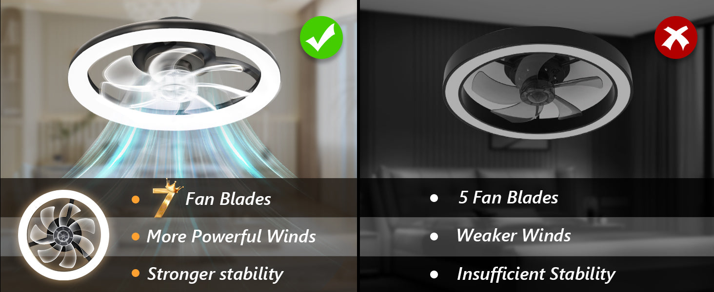 9.5W motor power runs smoothly and the maximum speed of 930RPM provides strong airflow. Compared to other brands with 5 fan blades, we use 7 fan blades to add more airflow and improve stability, make it the ideal choice for bedroom ceiling fan. Pure copper brushless silent motor can realize a quiet environment of less than 45dB, low noise design creates a comfortable living environment and improves sleep quality.