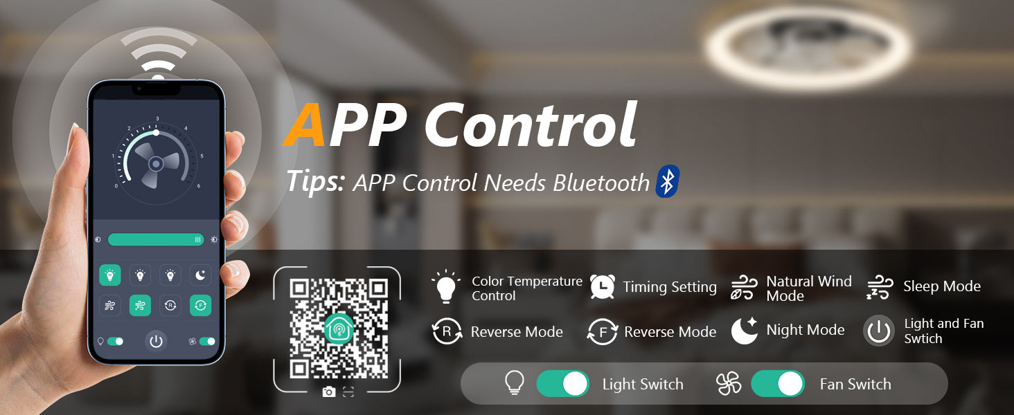 Our fan light you can freely switch between 2.4G remote control + Bluetooth APP for remote control.2.4G remote control can control the device at any angle compared to infrared remote control, with higher sensitivity, and also can realize the sleep timer (1H/2H) setting. APP control can help you to more easily and conveniently choose the comfortable wind speed and light remote control. (Tip: APP control requires your cell phone to turn on Bluetooth.)